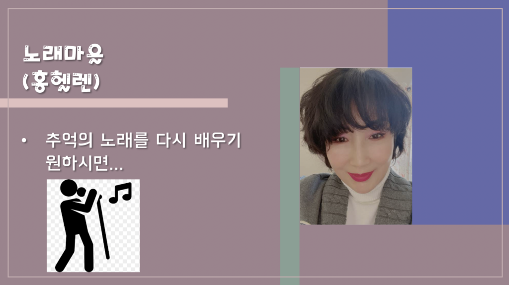 오래전에 느끼셨던 젊은날의 추억의 음악 감성속으로 빠져 보실래요? 어머니 아버지 들에 젊은날을 기억나게 해줄 행복한 시간을 누리세요 .추억의노래는 우리의오늘을 즐겁고 풍요롭게 만들어줍니다. 행복 대학의노래마을은 시니어분들의 행복한 시간을 약속 드립니다.