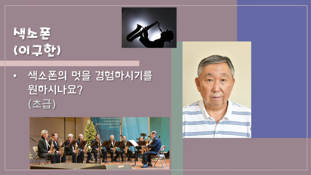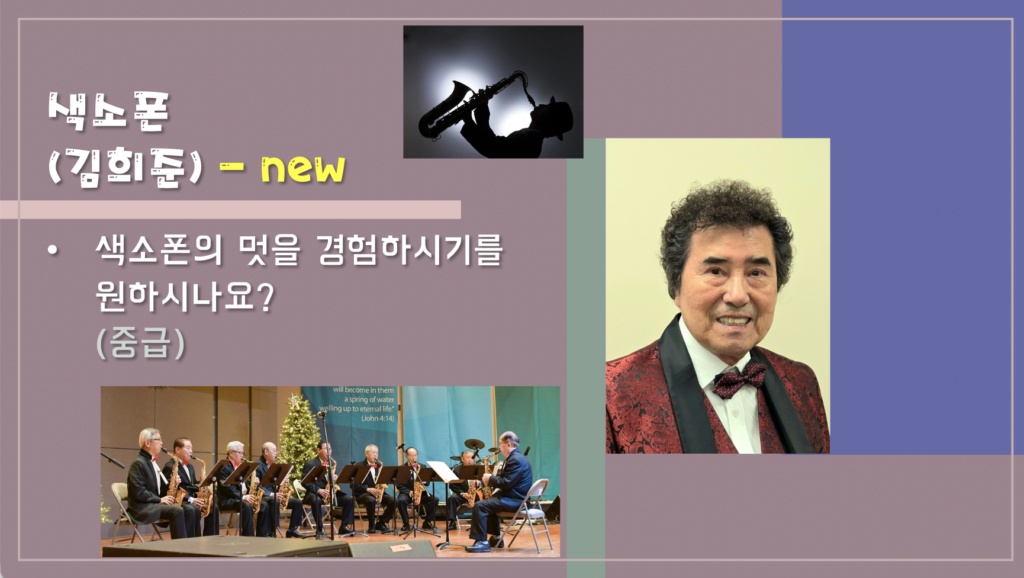 색소폰을 배우고 같이 연주를 하게된다. 처음 색소폰을 배우는 초급반과 새로운 곡을 연습하는 중급반이 있다.