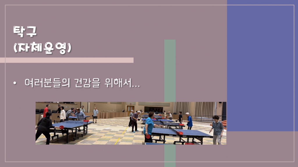 탁구은 건강을 유지하는데에 중요한 역할을 할 수 있다. 행복대학에서는 학기 중에 목요일과 토요일에 칠 수 있다.