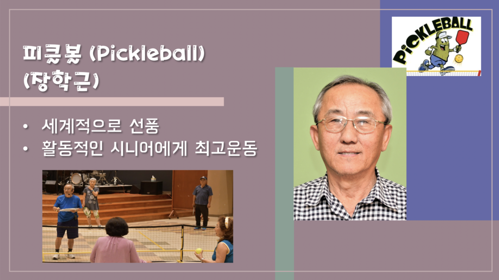 피클볼은 현재 미국에서 선풍적인 인기를 갖고있는 운동입니다. 탁구보다는 코트가 넗고 테니스보다는 작습니다. 그리하여 특히 시니어에게 좋고 재미있는 운동입니다. 쉽게 시작할 수 있는 운동이며 이 것 또한 프로선수들도 있습니다. 행복대학에서 피클볼은 밖에서 진행이 되며 우천시에는 안에서 진행하되 작은 장소에서 안전하게 치는 방법을 배우게 됩니다. 강사님은 피클볼 Teaching Certificate를 갖고 계십니다.