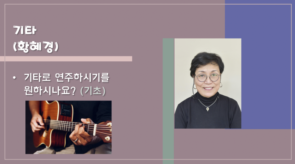 내용: 기초적인 음악이론과 코드(C,G, D, A, E 등)와 기본적인 스트로크 패턴 연습. 기타 잡는 법, 피킹 및 핑거 스타일의 기초. 간단한 곡 연주를 통해 실전 감각을 키우기.
