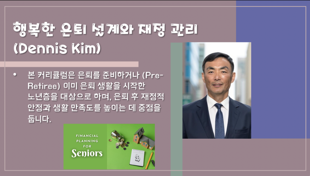 이 강의는 60대에서 70대 시니어들이 은퇴 후 돈 걱정 없이 행복하게 사실 수 있도록 돕는 과정입니다. 앞으로의 목표를 정하고, 매달 들어오는 연금 같은 소득과 생활비를 꼼꼼히 관리하는 기초부터 시작합니다. 나아가 자산을 안전하게 불리고 세금 부담을 줄이는 똑똑한 인출 방법, 가장 큰 걱정거리인 의료비(메디케어)와 장기 요양 준비, 집을 활용하는 주거 전략 등을 배웁니다.